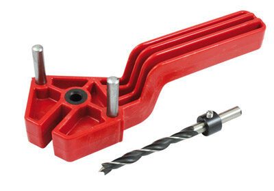 Met behulp van deze deuvelhulp kan eenvoudig midden op de kopse kant van een plank een gat gedoord worden om te deuvelen.