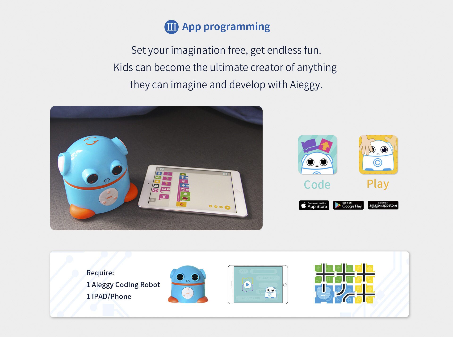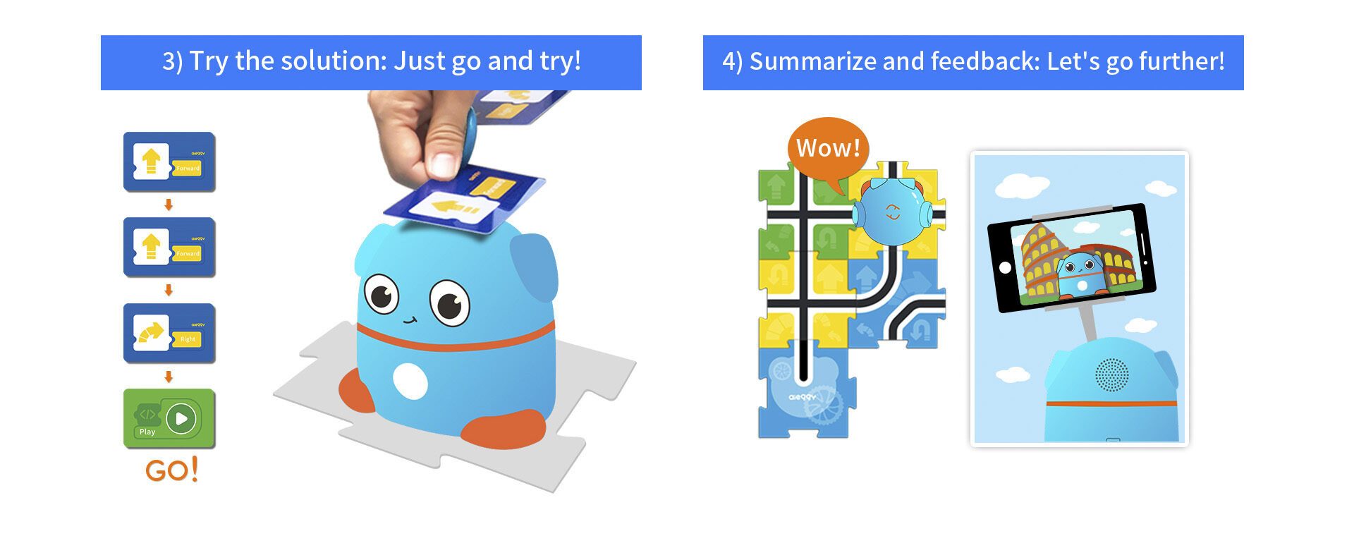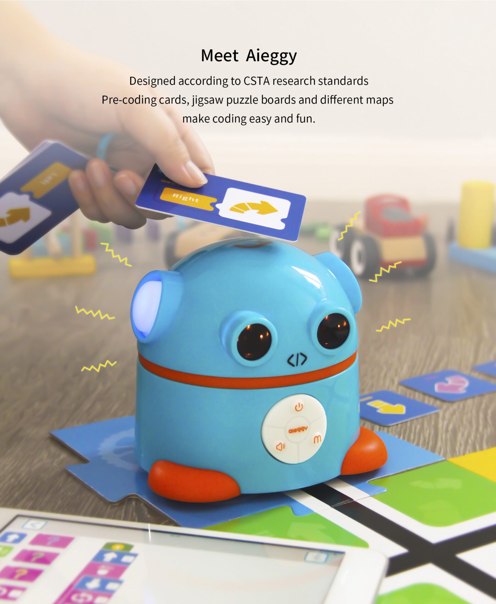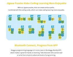 Aieggy behoort tot de nieuwste categorie robots voor kinderen van 4-8 jaar. Aieggy kan aangestuurd worden in de stijl van de BeeBot. Niet door op knopjes te drukken en te onthouden wat je gedaan hebt, maar via codingskaarten die Aieggy lezen kan. Vooruit. linksaf, rechtsaf en omdraaien. Daarnaast kunnen ook de “geheugenkaarten“, waar de richting van de codingskaart aangegeven is gebruikt worden. Voor iedere codering kan de geheugenkaart in rij gelegd worden, zodat kinderen altijd het overzicht hebben wat ze gecodeerd hebben. Zo wordt het coderen ook visueel en kunnen ze altijd de stappen van Aieggy volgen. Ook Aieggy rijdt 15 cm per stap, zodat de kaarten voor de BeeBot ook bij Aieggy gebruikt kunnen worden.