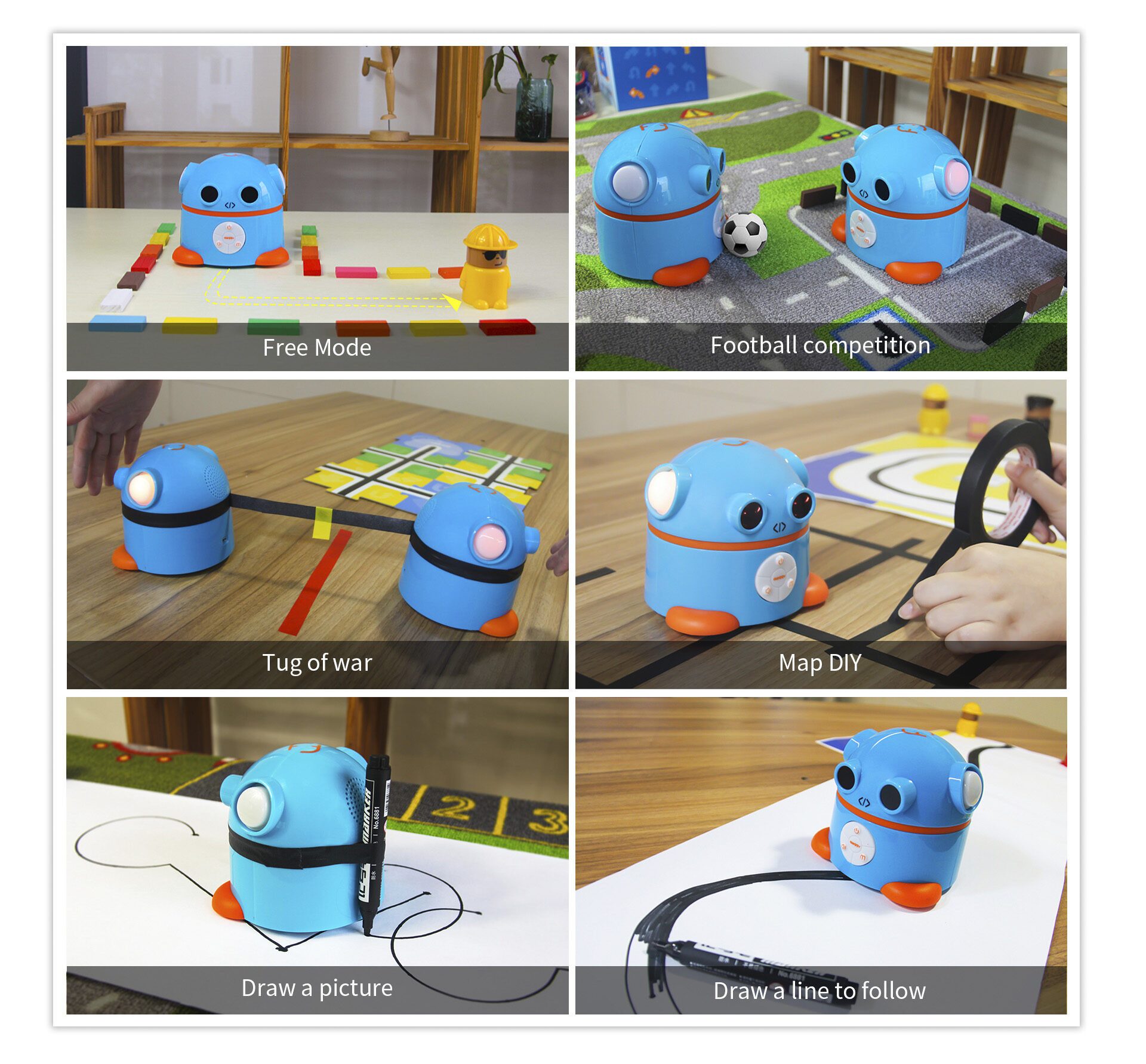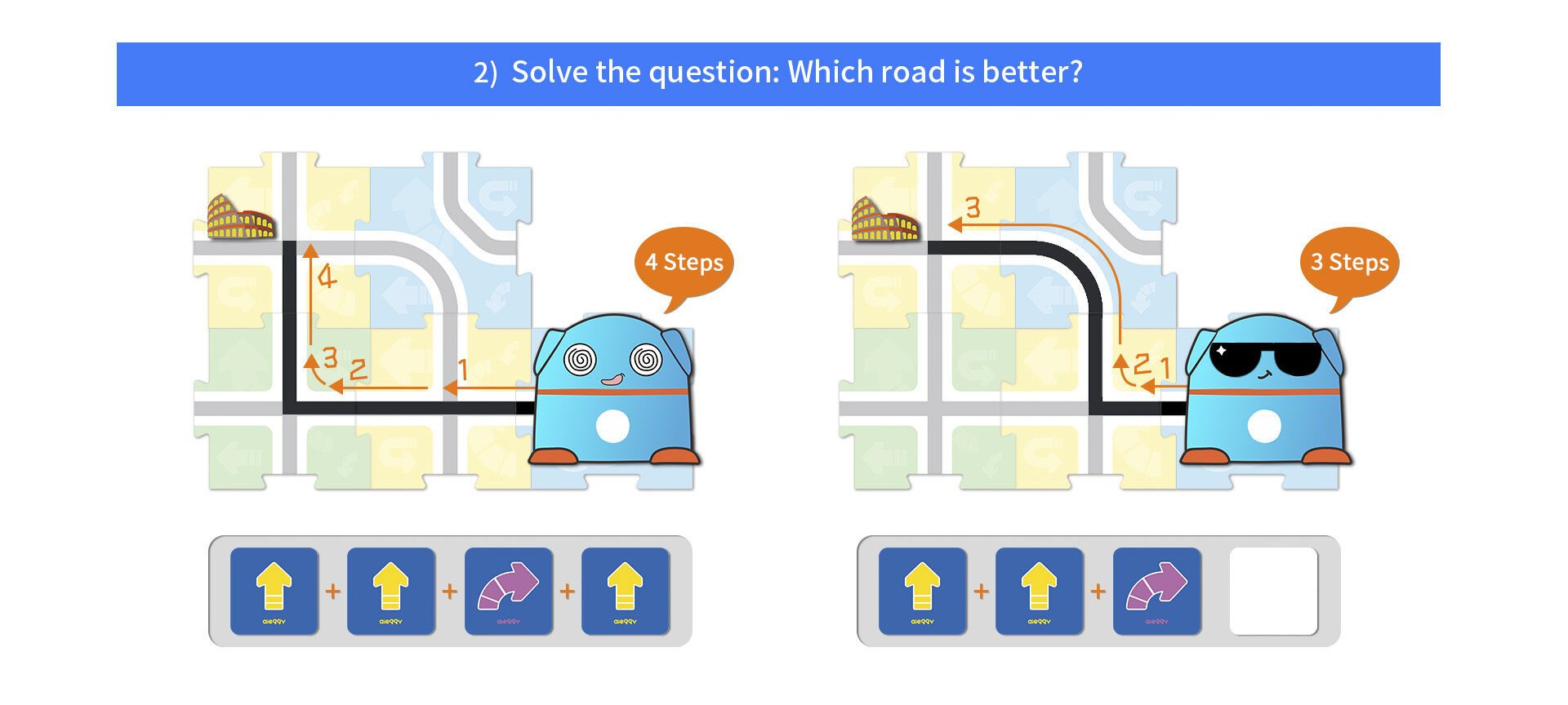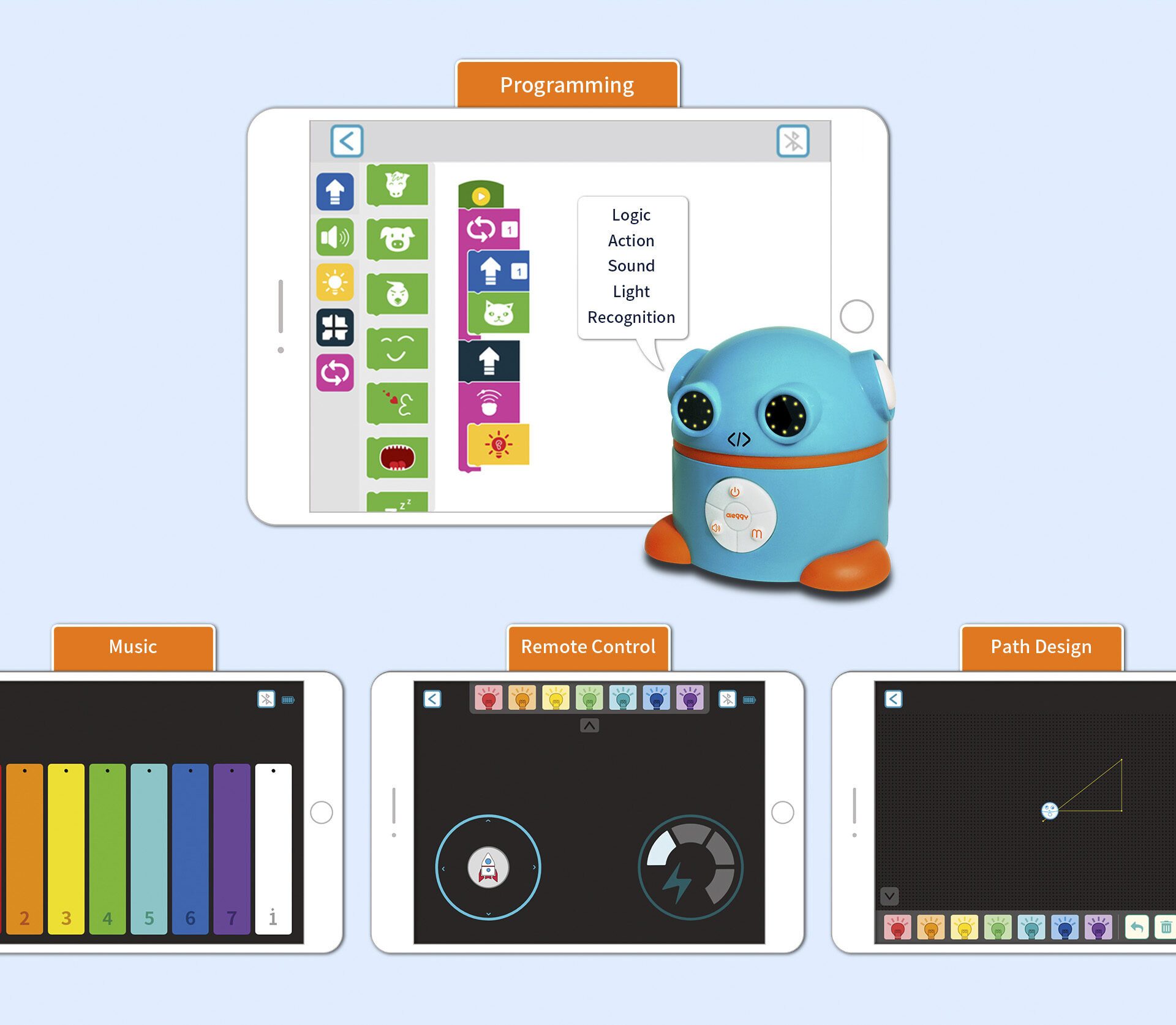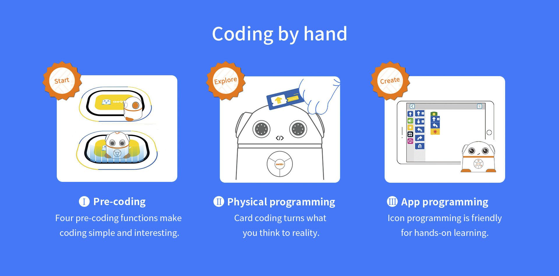 Aieggy behoort tot de nieuwste categorie robots voor kinderen van 4-8 jaar. Aieggy kan aangestuurd worden in de stijl van de BeeBot. Niet door op knopjes te drukken en te onthouden wat je gedaan hebt, maar via codingskaarten die Aieggy lezen kan. Vooruit. linksaf, rechtsaf en omdraaien. Daarnaast kunnen ook de “geheugenkaarten“, waar de richting van de codingskaart aangegeven is gebruikt worden. Voor iedere codering kan de geheugenkaart in rij gelegd worden, zodat kinderen altijd het overzicht hebben wat ze gecodeerd hebben. Zo wordt het coderen ook visueel en kunnen ze altijd de stappen van Aieggy volgen. Ook Aieggy rijdt 15 cm per stap, zodat de kaarten voor de BeeBot ook bij Aieggy gebruikt kunnen worden.