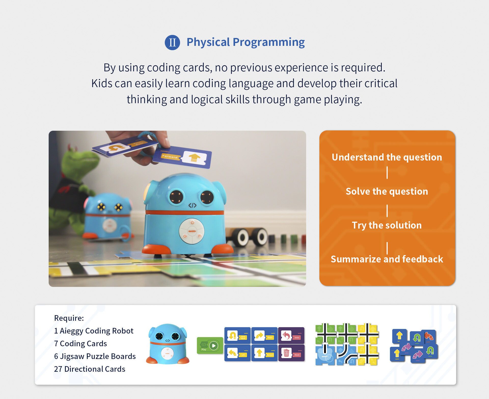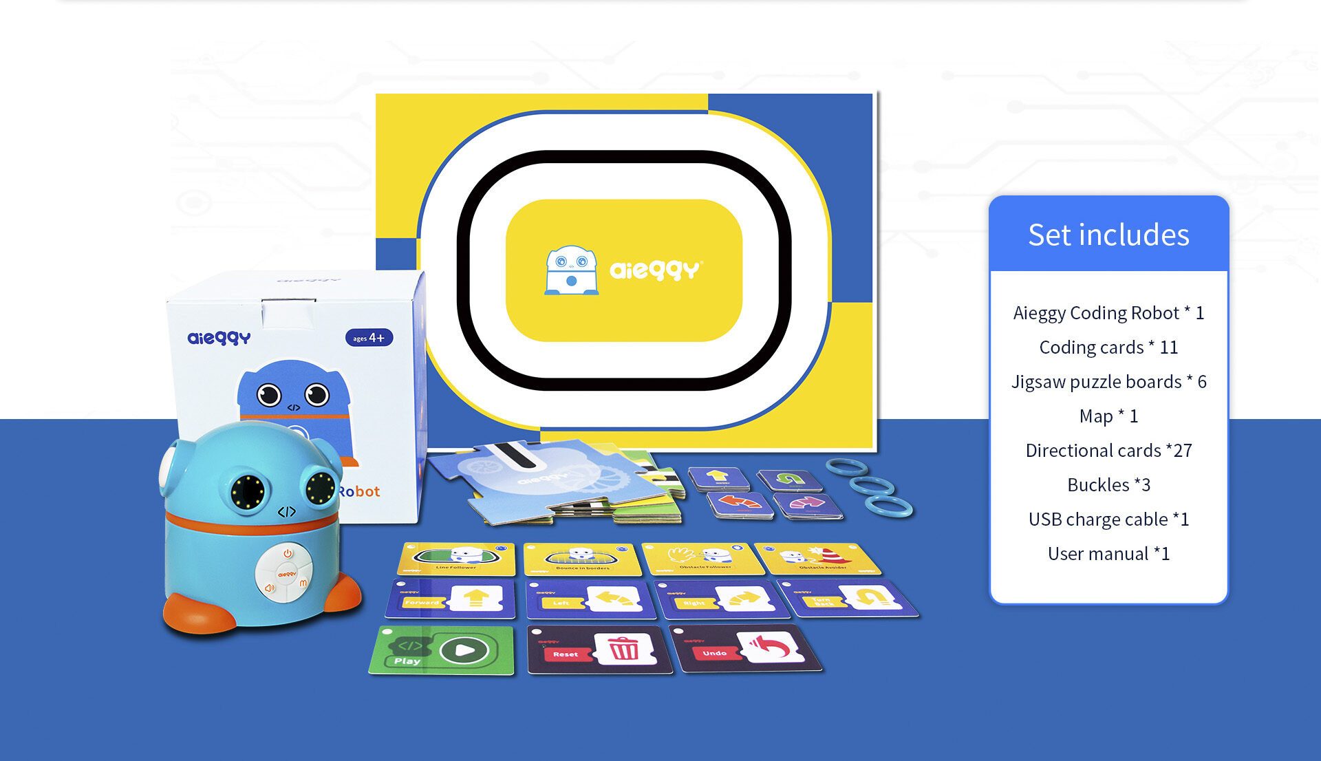 Aieggy bestaat uit 1 x Aieggy robot, 4 Pre codeerkaarten, 7 codeerkaarten, 1 A2 map met zwarte lijn. Puzzelstukken, 30 geheugenkaarten, ringen voor de Pre- en coderingskaarten, 1 x USB kabel en handleiding (Engels).