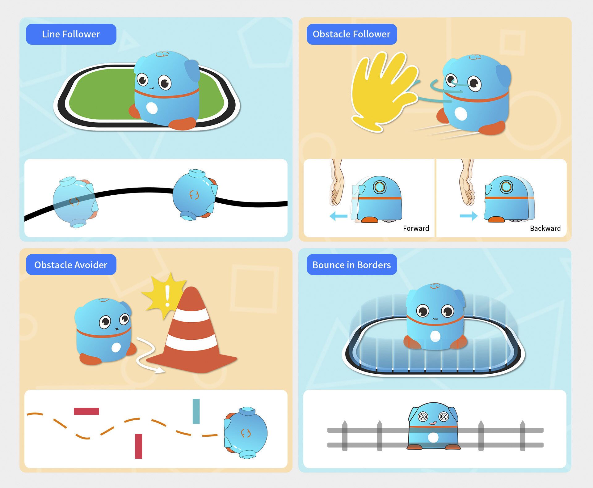 Er zijn ook nog 4 Pre-coderingskaarten, waarmee Aieggy gecodeerd kan worden als lijnvolger, Voorwerpen ontwijken, binnen lijnen blijven en bewegingen volgen door b.v. je hand voor Aieggy te houden en Aieggy vooruit of achteruit te laten rijden.