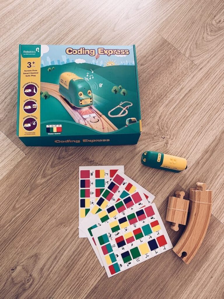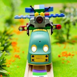 De set bestaat uit 24 houten rails-elementen, 1 x robot trein, 19 actie stickers en 1 handleiding