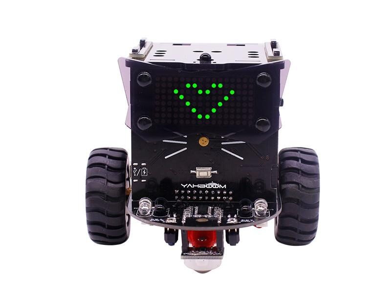 5 uitvoerapparaten: 2 8x8dot matrixschermen (ogen van de robot), 1 zoemer, 8 programmeerbare RGB-lampen, 2 motoren, 4 servo-interfaces.